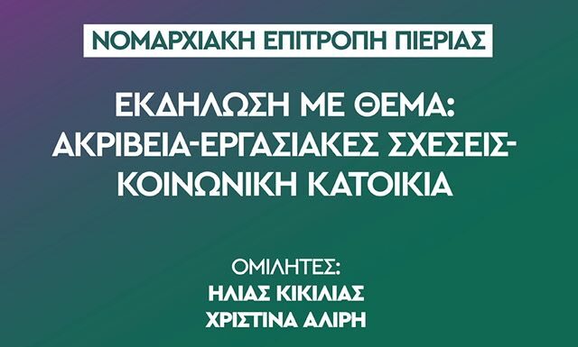 Η Νομαρχιακή Επιτροπή  ΠΑΣΟΚ - Κίνημα Αλλαγής Πιερίας το Σάββατο 20 Απριλίου και ώρα 19:30 διοργανώνει εκδήλωση με θέμα: Ακρίβεια - Εργασιακές Σχέσεις -...