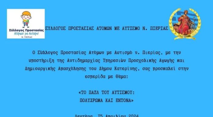 Εσπερίδα με θέμα: «Το παζλ του αυτισμού - πολύχρωμα και έντονα» θα πραγματοποιήσει ο Σύλλογος Προστασίας Ατόμων με Αυτισμό Ν.Πιερίας με την υποστήριξη της...