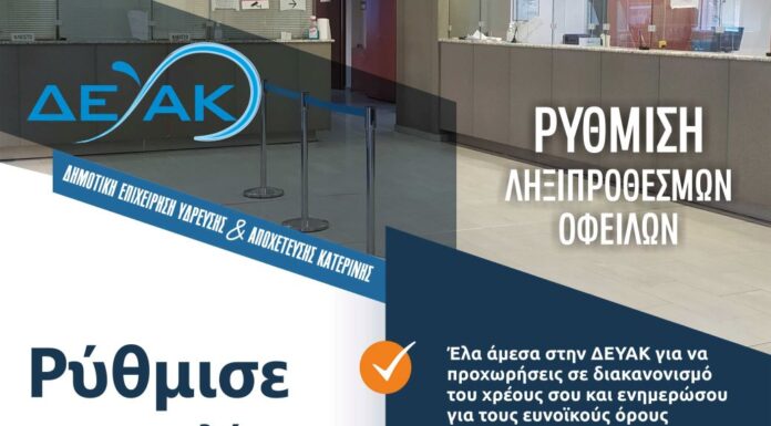 Σε ευνοϊκές ρυθμίσεις για όσους καταναλωτές έχουν ληξιπρόθεσμα χρέη προς την επιχείρηση προχωρά με απόφασή της η Δημοτική Επιχείρηση Ύδρευσης και Αποχέτευσης Κατερίνης. Η απόφαση...
