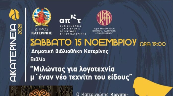 ΣΑΒΒΑΤΟ 15 ΝΟΕΜΒΡΙΟΥ ΏΡΑ: 19.00 Δημοτική βιβλιοθήκη Κατερίνης Ο Κατερινιώτης Κωνσταντίνος Δομηνίκ, ένας από τους ποιοτικότερους σύγχρονους νέους λογοτέχνες της Βόρειας Ελλάδας μιλάει για τα βιβλία του. Συνομιλεί...