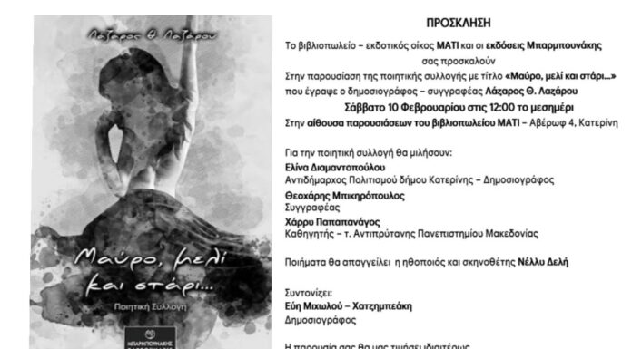 Την ποιητική του συλλογή με τίτλο «Μαύρο, μελί και στάρι…» πρόκειται να παρουσιάσει στην Κατερίνη, ο δημοσιογράφος – συγγραφέας Λάζαρος Λαζάρου. Η εκδήλωση παρουσίασης,...