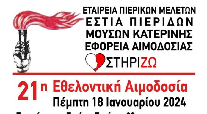 Την Πέμπτη 18 Ιανουαρίου 2024 η Εφορεία Αιμοδοσίας της ΕΣΤΊΑΣ ΠΙΕΡΊΔΩΝ ΜΟΥΣΏΝ ΚΑΤΕΡΙΝΗΣ και ο Σύλλογος Γονέων και Κηδεμόνων Ατόμων με Αναπηρία "ΣΤΗΡΙΖΩ" Ν.ΠΙΕΡΙΑΣ...
