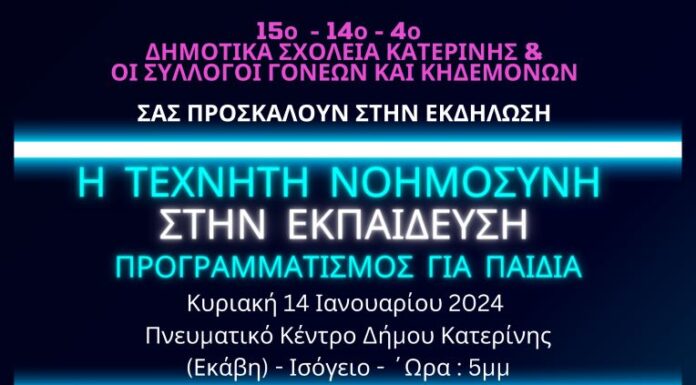 Η «Τεχνητή Νοημοσύνη στην Εκπαίδευση – Προγραμματισμός για παιδιά» αποτελεί το θεματολόγιο της εσπερίδας την οποία συνδιοργανώνουν από κοινού τρία Δημοτικά Σχολεία Κατερίνης, τα...