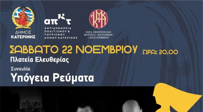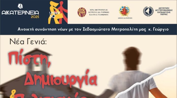 Τετάρτη 19 Νοεμβρίου & Ώρα: 11.00 π.μ. -  Πνευματικό Κέντρο Δήμου Κατερίνης (συνεδριακή αίθουσα - ισόγειο) Συνδιοργάνωση µε τη Διεύθυνση Δευτεροβάθµιας Εκπαίδευσης νοµού Πιερίας.