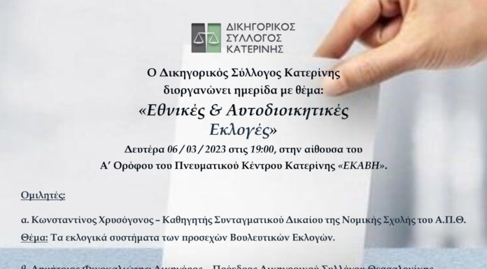 Ο Δικηγορικός Σύλλογος Κατερίνης διοργανώνει ημερίδα με θέμα τις Εθνικές και τις Αυτοδιοικητικές εκλογές, που θα πραγματοποιηθεί την Δευτέρα 6 Μαρτίου 2023 στις 07:00...