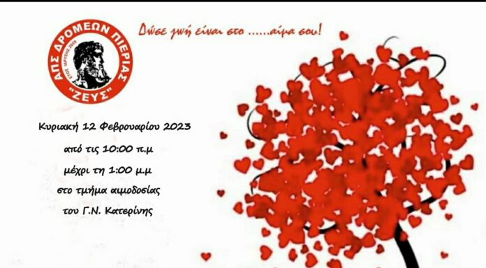 Σας προσκαλούμε στην ετήσια τακτική εθελοντική αιμοδοσία του Συλλόγου μας, την Κυριακή 12 Φεβρουαρίου 2023 στο τμήμα αιμοδοσίας του Γ.Ν. Κατερίνης. Σας περιμένουμε!