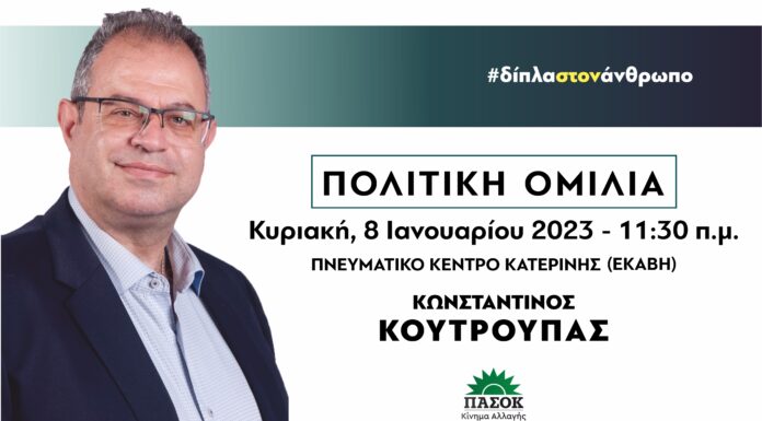 Πολιτική ομιλία θα πραγματοποιήσει ο χειρουργός ΩΡΛ Κωνσταντίνος Κουτρούπας αυτήν την Κυριακή 8 Ιανουαρίου 2023, στις 11:30 πμ, στο Πνευματικό Κέντρο Κατερίνης (ΕΚΑΒΗ). Ο Κωνσταντίνος...