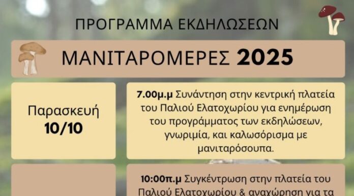 Οι Μανιταρόφιλοι Ελατοχωρίου - Κεντρικής Μακεδονίας και ο Πολιτιστικός σύλλογος Παλιού Ελατοχωρίου σας προσκαλούν στις "Μανιταρομέρες 2025" στο Ελατοχώρι Πιερίας στις 10,11 και 12...