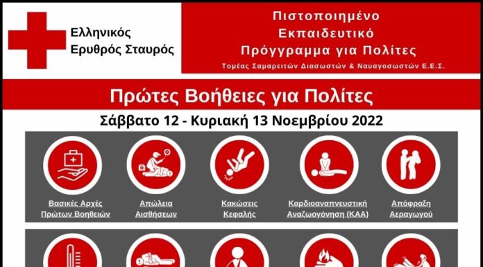 Το Σώμα Σαμαρειτών, Διασωστών και Ναυαγοσωστών του Περιφερειακού Τμήματος Κατερίνης του Ελληνικού Ερυθρού Σταυρού, θα υλοποιήσει το 12ωρο εκπαιδευτικό πρόγραμμα “ΠΡΩΤΕΣ ΒΟΗΘΕΙΕΣ ΓΙΑ ΠΟΛΙΤΕΣ”,...