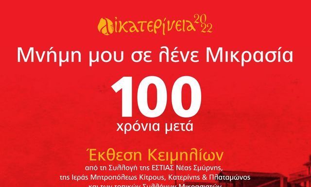 «Μνήμη μου σε λένε Μικρασία - 100 Χρόνια μετά», τιτλοφορείται η Έκθεση Κειμηλίων από τις Συλλογές: της ΕΣΤΙΑΣ Νέας Σμύρνης, της Ιεράς Μητροπόλεως Κίτρους,...