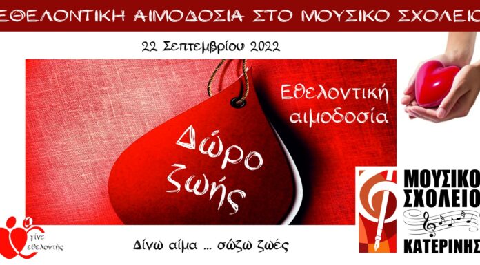 Την Πέμπτη στις 22 Σεπτεμβρίου στο Μουσικό Σχολείο Κατερίνης δίνουμε στους μαθητές μας ένα μάθημα ζωής. Διοργανώνουμε εθελοντική αιμοδοσία που θα ξεκινήσει από τις 9:00...