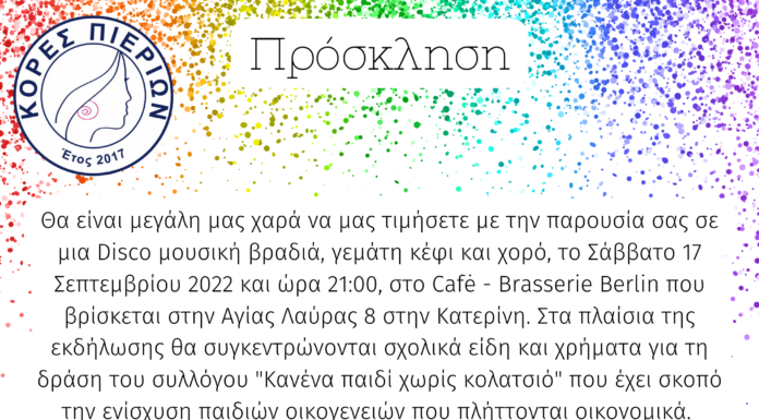 Ο σύλλογος "Κόρες Πιερίων" σας προσκαλεί σε μια Disco μουσική βραδιά, γεμάτη κέφι και χορό, το Σάββατο 17 Σεπτεμβρίου και ώρα 21:00, στο Café...