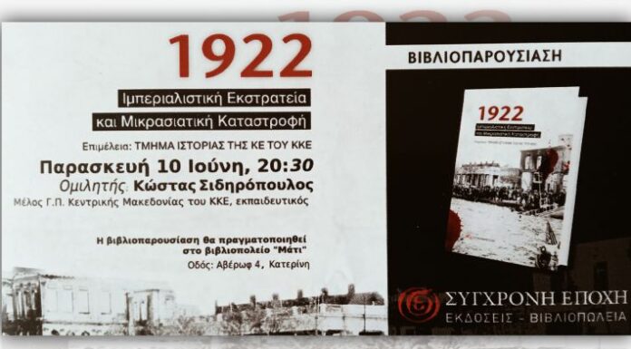 Η ΤΕ Πιερίας του ΚΚΕ θα πραγματοποιήσει βιβλιοπαρουσίαση της νέας έκδοσης της «Σύγχρονης Εποχής»: «1922. Ιμπεριαλιστική εκστρατεία και Μικρασιατική καταστροφή», την Παρασκευή 10 Ιούνη...