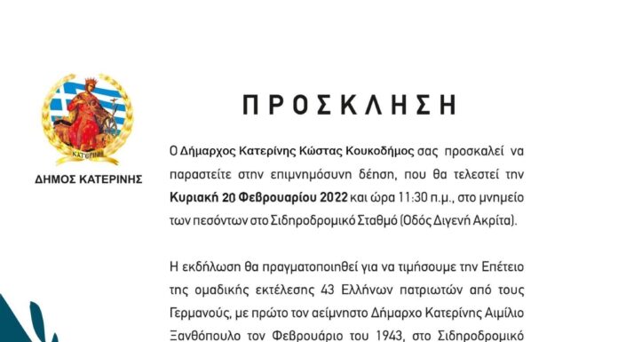 Την Κυριακή 20 Φεβρουαρίου 2022 στις 11:30 π.μ. στον Σιδ. Σταθμό (οδός Διγενή Ακρίτα), θα πραγματοποιηθεί από το Δήμο Κατερίνης η τελετή μνήμης και...
