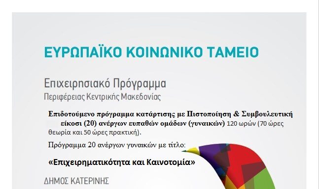 ΕΠΙΔΟΤΟΥΜΕΝΟ ΠΡΟΓΡΑΜΜΑ ΚΑΤΑΡΤΙΣΗΣ ΑΝΕΡΓΩΝ ΠΡΑΞΗ: «Ανάπτυξη δεξιοτήτων ανέργων ευπαθών ομάδων στην περιοχή παρέμβασης της Στρατηγικής Βιώσιμης Αστικής Ανάπτυξης (ΣΒΑΑ) Κατερίνης» Κωδικός ΟΠΣ 5067557. Υποέργο  1. Ενίσχυση...
