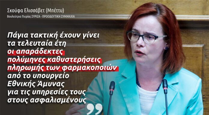 Μπ.Σκούφα: «Πάγια τακτική έχουν γίνει τα τελευταία έτη οι απαράδεκτες πολύμηνες καθυστερήσεις πληρωμής των φαρμακοποιών από το υπουργείο Εθνικής Άμυνας για τις υπηρεσίες τους...