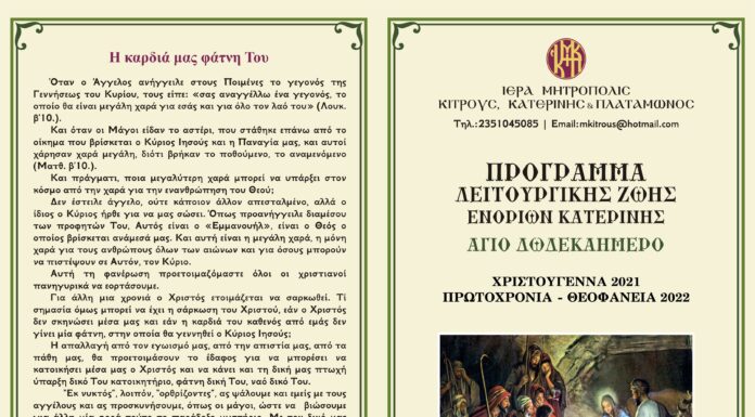 Ενόψει των Χριστουγέννων, η Ιερά Μητρόπολις Κίτρους, Κατερίνης και Πλαταμώνος έχει καταρτίσει ειδικό πρόγραμμα Ιερών Ακολουθιών και Θ. Λειτουργιών. Συγκεκριμένα: ΠΕΜΠΤΗ 23 ΔΕΚΕΜΒΡΙΟΥ Μεγάλες Ώρες Χριστουγέννων προεξάρχοντος...