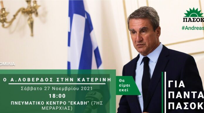 Ο υποψήφιος Πρόεδρος του ΠΑΣΟΚ-Κινήματος Αλλαγής Ανδρέας Λοβέρδος θα βρίσκεται στην Κατερίνη, αύριο Σάββατο 27/11. Στις 18:00 θα απευθύνει πολιτική ομιλία στο Πνευματικό Κέντρο «ΕΚΑΒΗ».