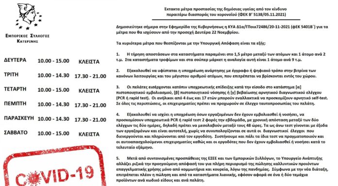 Με νέο ωράριο θα λειτουργούν από την Δευτέρα 22 Νοεμβρίου 2021, έως και την Δευτέρα 6 Δεκεμβρίου τα εμπορικά καταστήματα στη Κατερίνη. Συγκεκριμένα, σύμφωνα...