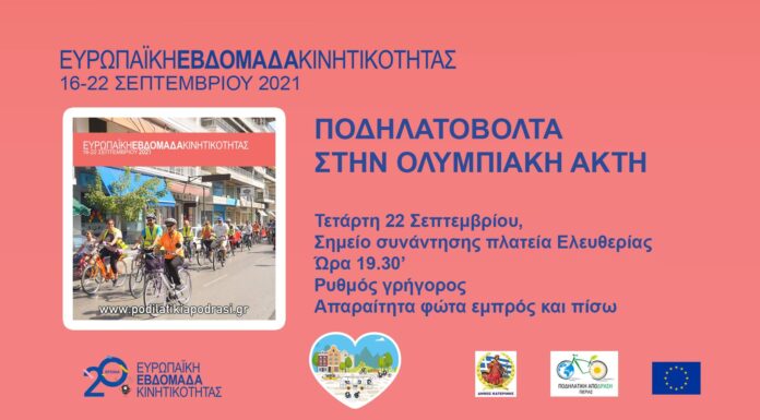 Ο εορτασμός της Ευρωπαϊκής Εβδομάδας Κινητικότητας κλείνει την Τετάρτη 22 Σεπτεμβρίου με μία ποδηλατοβόλτα στην Ολυμπιακή Ακτή. Ντυθείτε ανάλογα με ανοιχτόχρωμα ρούχα, ελέγξτε τα ποδήλατά...