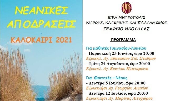 Με ιδιαίτερη χαρά παρουσιάζουμε το πρόγραμμα των νεανικών αποδράσεων, που διοργανώνει για ακόμη ένα καλοκαίρι το γραφείο νεότητας της Ιεράς Μητροπόλεώς μας και αφορά:...
