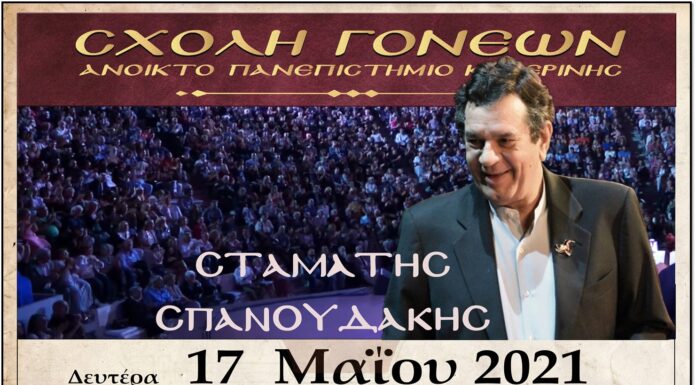 Συνέντευξη εφ’ όλης της ύλης θα παραχωρήσει ο γνωστός συνθέτης Σταμάτης Σπανουδάκης σε μια έκτακτη διαδικτυακή εκδήλωση της Σχολής Γονέων – Ανοικτό Πανεπιστήμιο Κατερίνης την Δευτέρα...