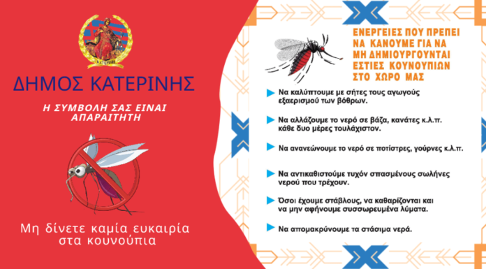 Ο Δήμος Κατερίνης ξεκίνησε στις αρχές Απριλίου ψεκασμούς στον αστικό παραλιακό ιστό Ενημερωτικό έντυπο διανέμεται πόρτα – πόρτα στους δημότες με τα...