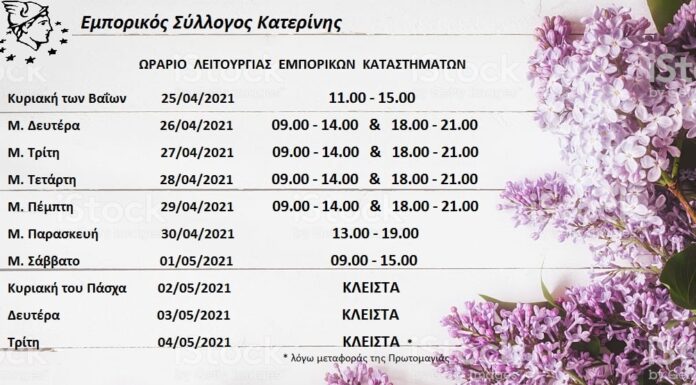 Ο Εμπορικός Σύλλογος Κατερίνης σας ενημερώνει για το εορταστικό ωράριο των εμπορικών καταστημάτων της πόλης μας για την περίοδο του Πάσχα. Ο εμπορικός κόσμος της...