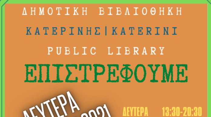 Η  Δημοτική Βιβλιοθήκη Κατερίνης ξεκινάει σταδιακά τη λειτουργία της από την προσεχή Δευτέρα 19 Απριλίου. ΕΠΙΣΤΡΟΦΗ ΥΛΙΚΟΥ H επιστροφή των βιβλίων θα γίνεται στην είσοδο της...