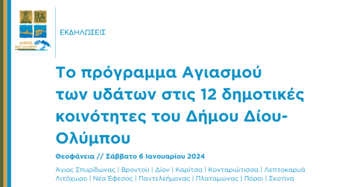 Το πρόγραμμα καθαγιασμού των υδάτων στις δώδεκα δημοτικές κοινότητες του Δήμου Δίου-Ολύμπου, την ημέρα εορτασμού των Θεοφανείων (Σάββατο 6 Ιανουαρίου 2024) συνοψίζεται ως εξής: Άγιος...