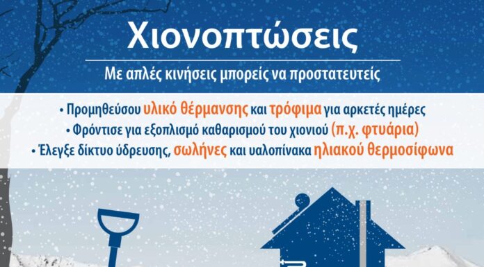 ΧΙΟΝΟΠΤΩΣΕΙΣ ΠΡΟΕΤΟΙΜΑΣΤΕΙΤΕ Αν κατοικείτε σε ορεινή ή δύσβατη περιοχή που αντιμετωπίζει προβλήματα από χιονοπτώσεις Προμηθευτείτε υλικό θέρμανσης και τρόφιμα για αρκετές ημέρες. Φροντίστε για εξοπλισμό καθαρισμού...