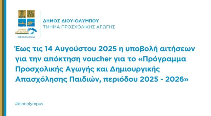 Ο Δήμος Δίου-Ολύμπου ενημερώνει τους ενδιαφερόμενους γονείς που επιθυμούν τη φιλοξενία των παιδιών τους στους Παιδικούς Σταθμούς Καρίτσας, Λεπτοκαρυάς, Λιτοχώρου και Νέας Εφέσου για...