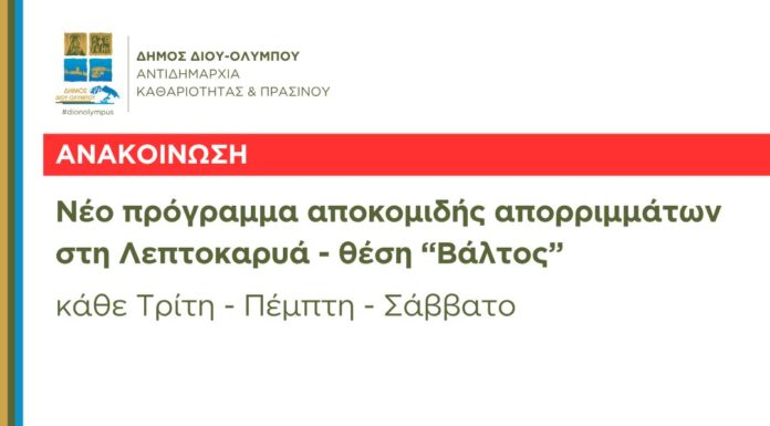 Από την Αντιδημαρχία Καθαριότητας και Πρασίνου του Δήμου Δίου-Ολύμπου ανακοινώνεται ότι η αποκομιδή των απορριμμάτων στη Λεπτοκαρυά (θέση «Βάλτος») θα πραγματοποιείται κάθε Τρίτη, Πέμπτη...