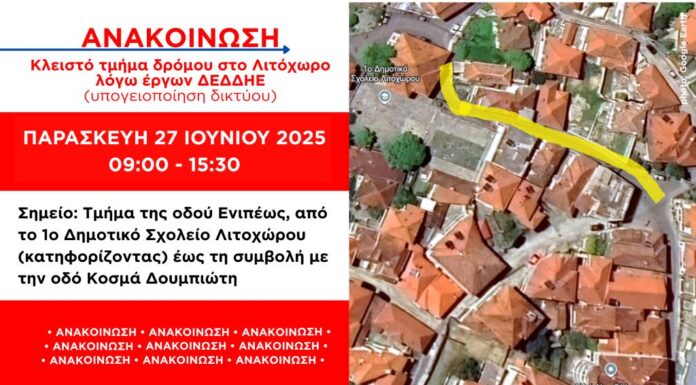 Σύμφωνα με ενημέρωση του ΔΕΔΔΗΕ, την Παρασκευή 27 Ιουνίου 2025 και ώρες 09:00-15:30 θα είναι κλειστό το τμήμα της οδού Ενιπέως στο Λιτόχωρο, από...
