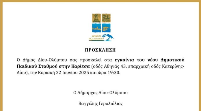 Ο Δήμος Δίου-Ολύμπου σας προσκαλεί στα εγκαίνια του νέου Δημοτικού Παιδικού Σταθμού στην Καρίτσα (οδός Αθηνάς 43, επαρχιακή οδός Κατερίνης-Δίου), την Κυριακή 22 Ιουνίου...