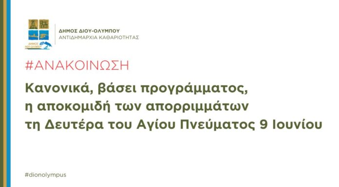 Από την Αντιδημαρχία Καθαριότητας του Δήμου Δίου-Ολύμπου ανακοινώνεται ότι η αποκομιδή των απορριμμάτων τη Δευτέρα του Αγίου Πνεύματος 9 Ιουνίου 2025, θα πραγματοποιηθεί κανονικά,...