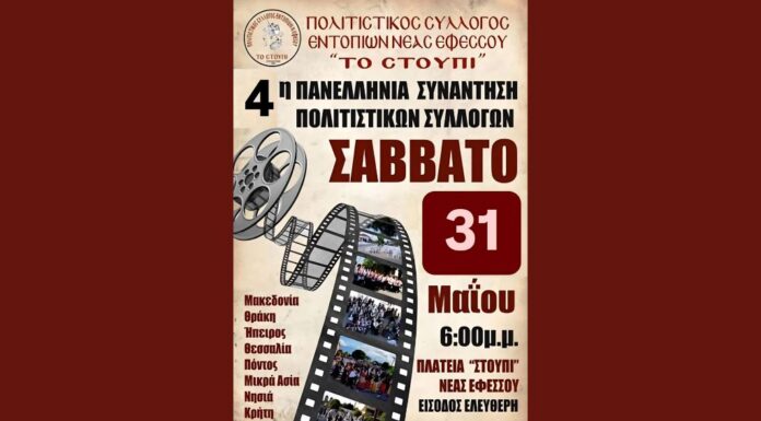 Σας προσκαλούμε στην 4η Πανελλήνια Συνάντηση Πολιτιστικών Συλλόγων που θα πραγματοποιηθεί το Σάββατο 31 Μαΐου 2025 στις 18:00 στην πλατεία "Στουπί" της Νέας Εφέσου...