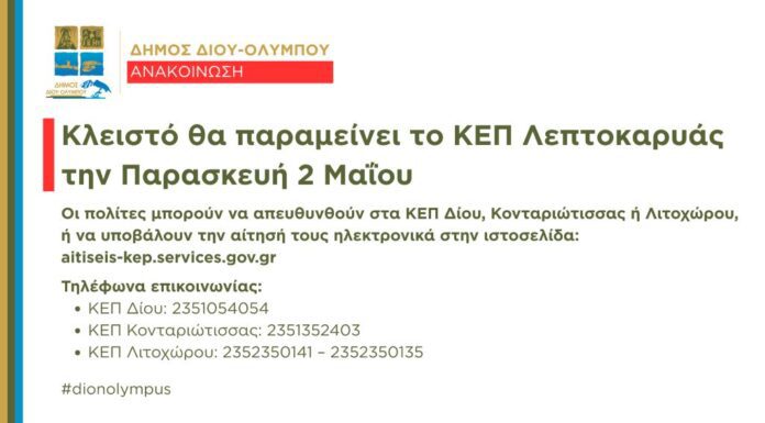 Κλειστό θα παραμείνει το ΚΕΠ Λεπτοκαρυάς την Παρασκευή 2 Μαΐου 2025. Οι πολίτες μπορούν να απευθυνθούν στα ΚΕΠ Δίου, Κονταριώτισσας ή Λιτοχώρου, ή να υποβάλουν...