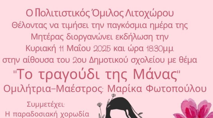 Ο Πολιτιστικός Όμιλος Λιτοχώρου θέλοντας να τιμήσει την παγκόσμια ημέρα της Μητέρας διοργανώνει εκδήλωση με θέμα «Το τραγούδι της Μάνας» την Κυριακή 11 Μαΐου...