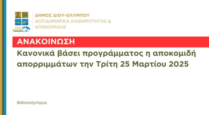 Από την Αντιδημαρχία Καθαριότητας και Διαχείρισης Πρασίνου του Δήμου Δίου-Ολύμπου ανακοινώνεται ότι την Τρίτη 25 Μαρτίου 2025 η αποκομιδή των απορριμμάτων θα γίνει κανονικά,...