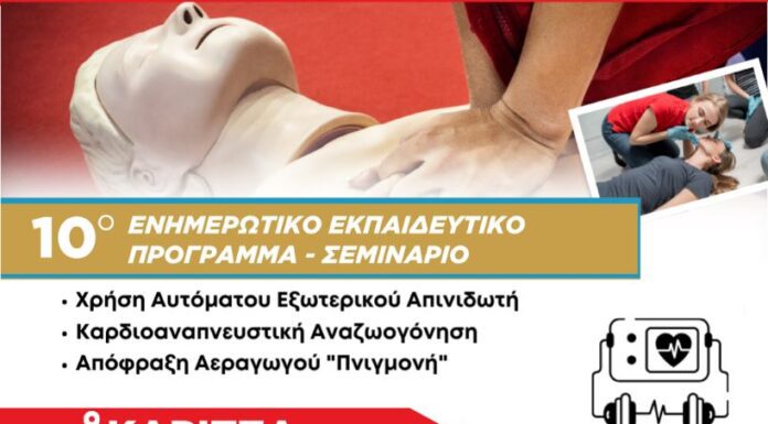 Το Σάββατο 29 Μαρτίου 2025 (ώρα 19:00) θα πραγματοποιηθεί στο Πολιτιστικό Κέντρο «Μακεδονία» στην Καρίτσα το 10ο δωρεάν ενημερωτικό-εκπαιδευτικό σεμινάριο χρήσης απινιδωτή, απόφραξης αεραγωγού «Πνιγμονή» και καρδιοαναπνευστικής αναζωογόνησης. Τα...