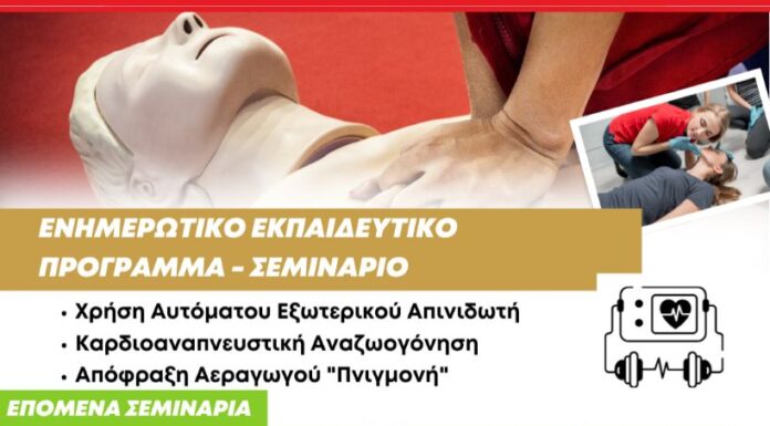 Το Σάββατο 8 Μαρτίου 2025 (ώρα 18:00) θα πραγματοποιηθεί στην αίθουσα πολλαπλών χρήσεων του Γυμνασίου Λεπτοκαρυάς το 7ο δωρεάν ενημερωτικό-εκπαιδευτικό σεμινάριο χρήσης απινιδωτή, απόφραξης...
