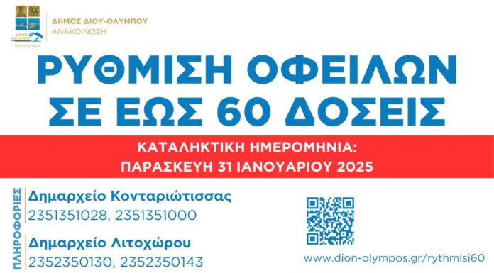 Λήγει στις 31 Ιανουαρίου 2025 η προθεσμία για την υποβολή αιτήσεων για ένταξη στην ευνοϊκή ρύθμιση οφειλών προς τον Δήμο σε έως και 60...