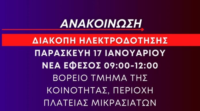 Σύμφωνα με ενημέρωση του ΔΕΔΔΗΕ αύριο Παρασκευή 17 Ιανουαρίου 2025 έχει προγραμματιστεί η ακόλουθη διακοπή στην ηλεκτροδότηση: ΝΕΑ ΕΦΕΣΟΣ 09:00-12:00 ΒΟΡΕΙΟ ΤΜΗΜΑ ΤΟΥ ΧΩΡΙΟΥ, ΠΕΡΙΟΧΗ ΤΗΣ ΠΛΑΤΕΙΑΣ...