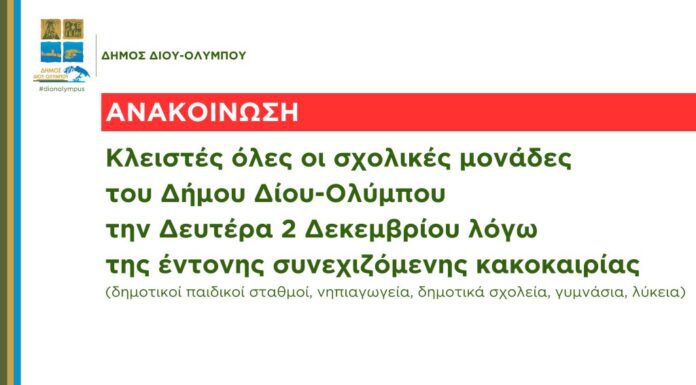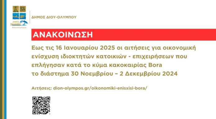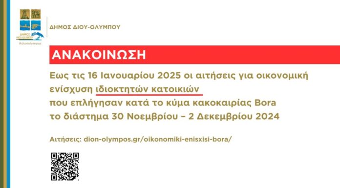 Ο Δήμος Δίου-Ολύμπου καλεί τους ιδιοκτήτες κατοικιών που υπέστησαν ζημίες από τα έντονα καιρικά φαινόμενα που σημειώθηκαν το διάστημα 30 Νοεμβρίου – 2 Δεκεμβρίου...