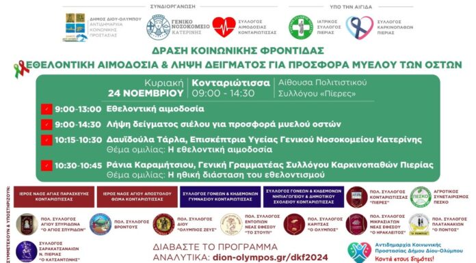 Ενημερωτική εκδήλωση για τη σημασία της εθελοντικής αιμοδοσίας και της προσφοράς μυελού των οστών, με παράλληλη εθελοντική αιμοδοσία και λήψη δειγμάτων σιέλου για προσφορά...