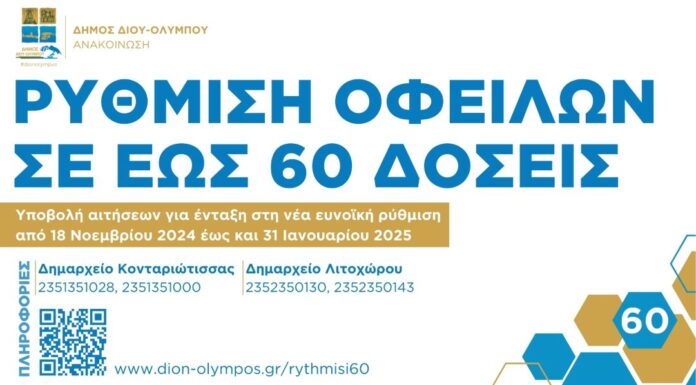 Ξεκινά τη Δευτέρα 18 Νοεμβρίου 2024 η υποβολή αιτήσεων για ένταξη στην ευνοϊκή ρύθμιση οφειλών προς τον Δήμο σε έως και 60 δόσεις, βάσει...