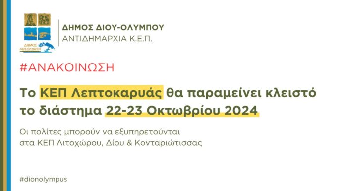 Από την Αντιδημαρχία ΚΕΠ Δήμου Δίου-Ολύμπου ανακοινώνεται ότι το ΚΕΠ Λεπτοκαρυάς θα παραμείνει κλειστό το διάστημα 22-23 Οκτωβρίου 2024. Οι πολίτες μπορούν να απευθυνθούν στα...