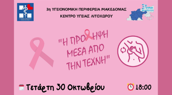 Στο πλαίσιο του μήνα ενημέρωσης και ευαισθητοποίησης για τον καρκίνο του μαστού, σας προσκαλούμε στην ενημερωτική εκδήλωση του Κέντρου Υγείας Λιτοχώρου «Η πρόληψη μέσα...