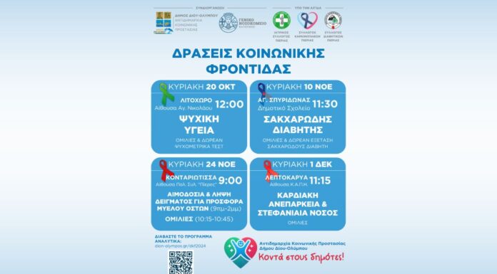 Η Αντιδημαρχία Κοινωνικής Προστασίας του Δήμου Δίου-Ολύμπου και το Γενικό Νοσοκομείο Κατερίνης, στο πλαίσιο του προγράμματος ενημερωτικών δράσεων ευαισθητοποίησης και κοινωνικής φροντίδας του Δήμου...
